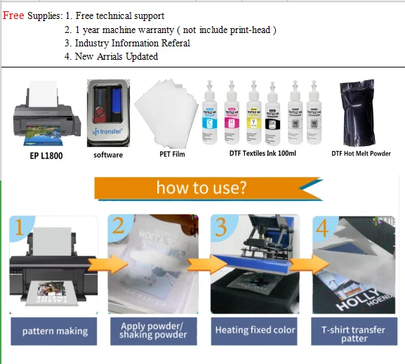 Use modified epson inkjet printer with software and special ink to print image on the PET film, color and white ink color printed out at the same time then spray with hot melt powder on the PET film, use heat press machine to heat up, after that put the PET film on the t shirts for heat transfer and you will get a perfect customized t shirt.